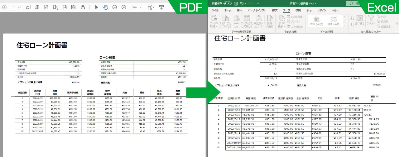 PDF ファイル内の表を Office ソフトのファイルに変換することができます。
