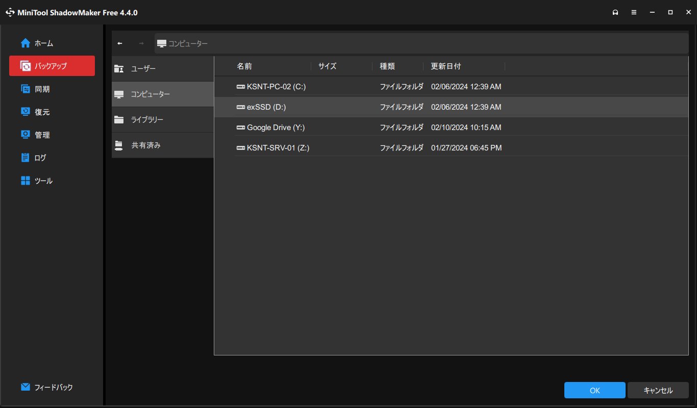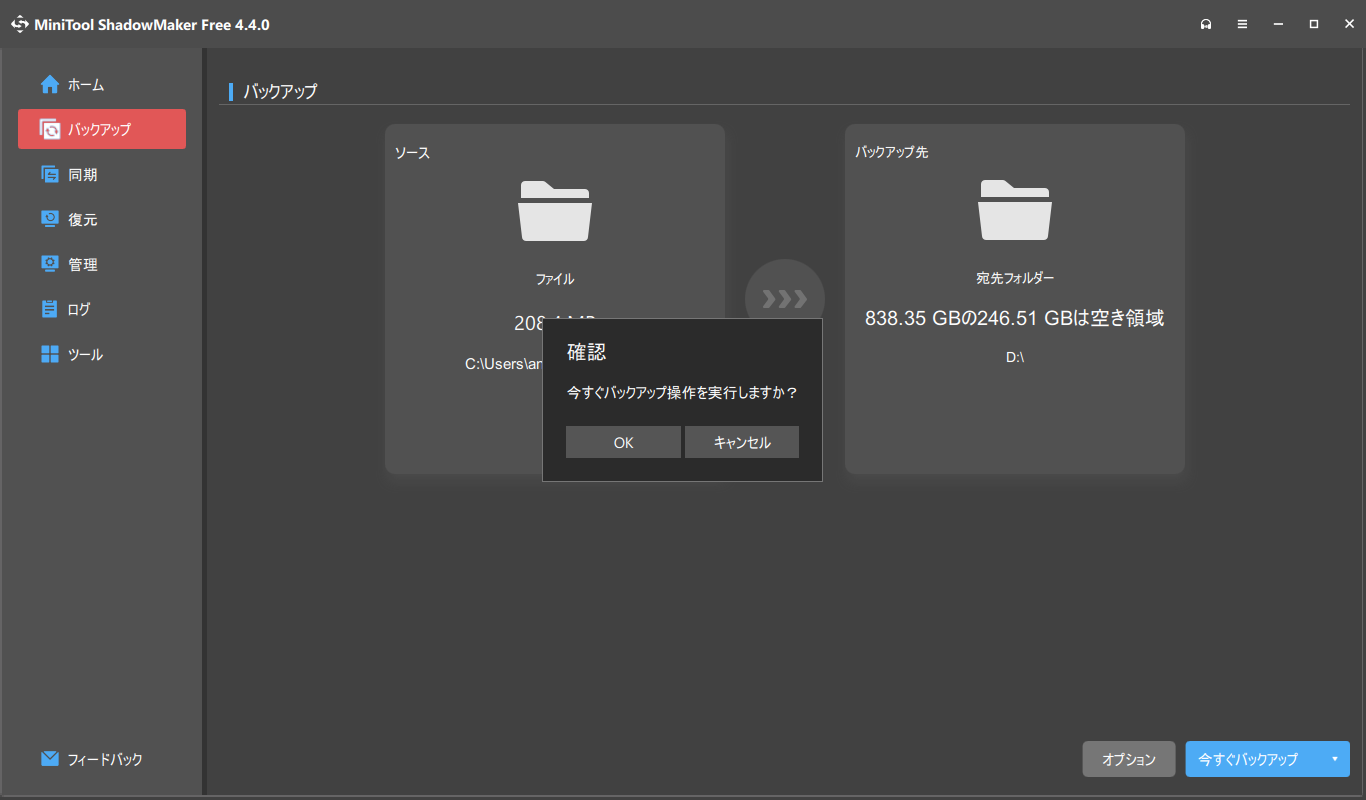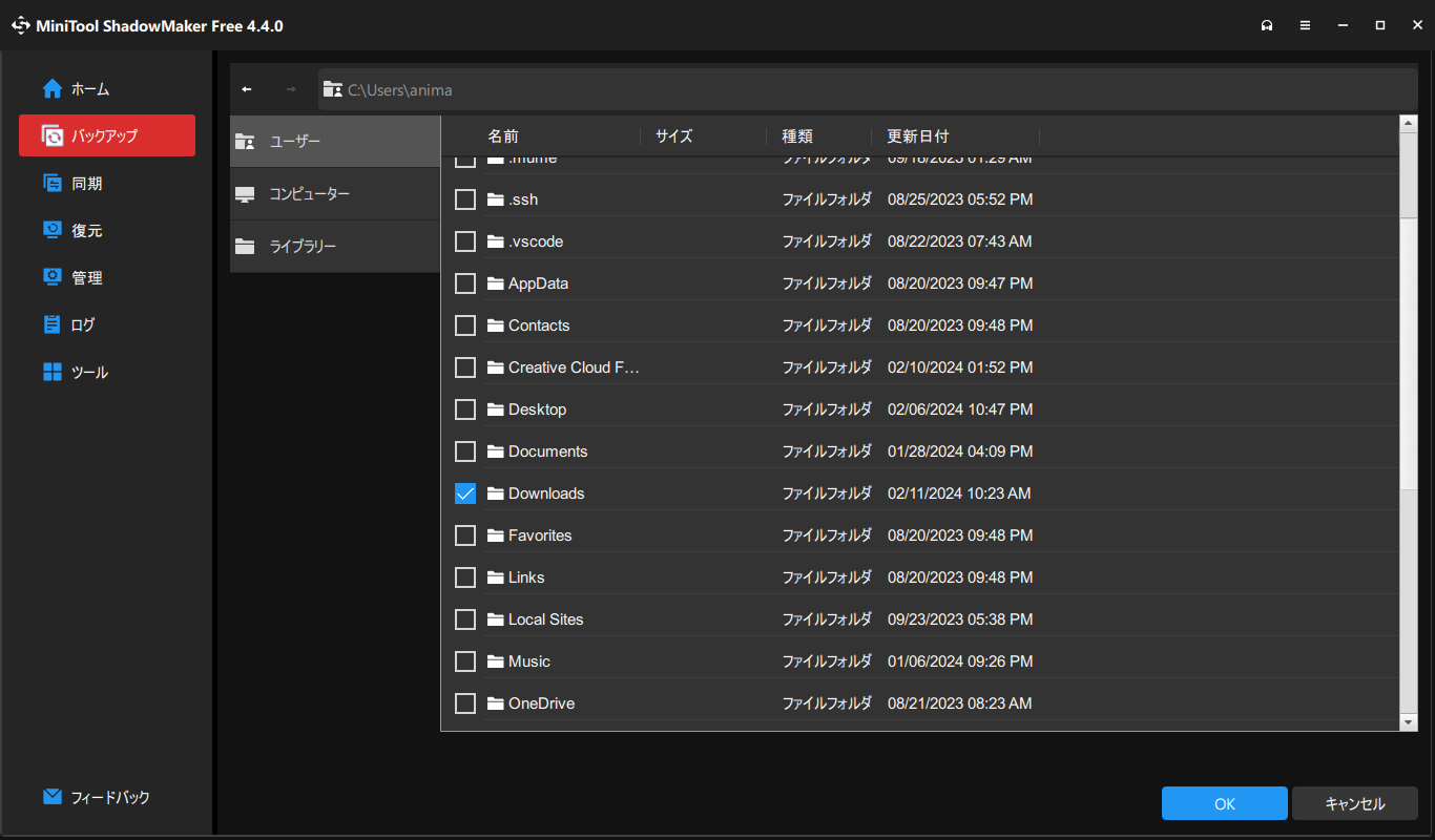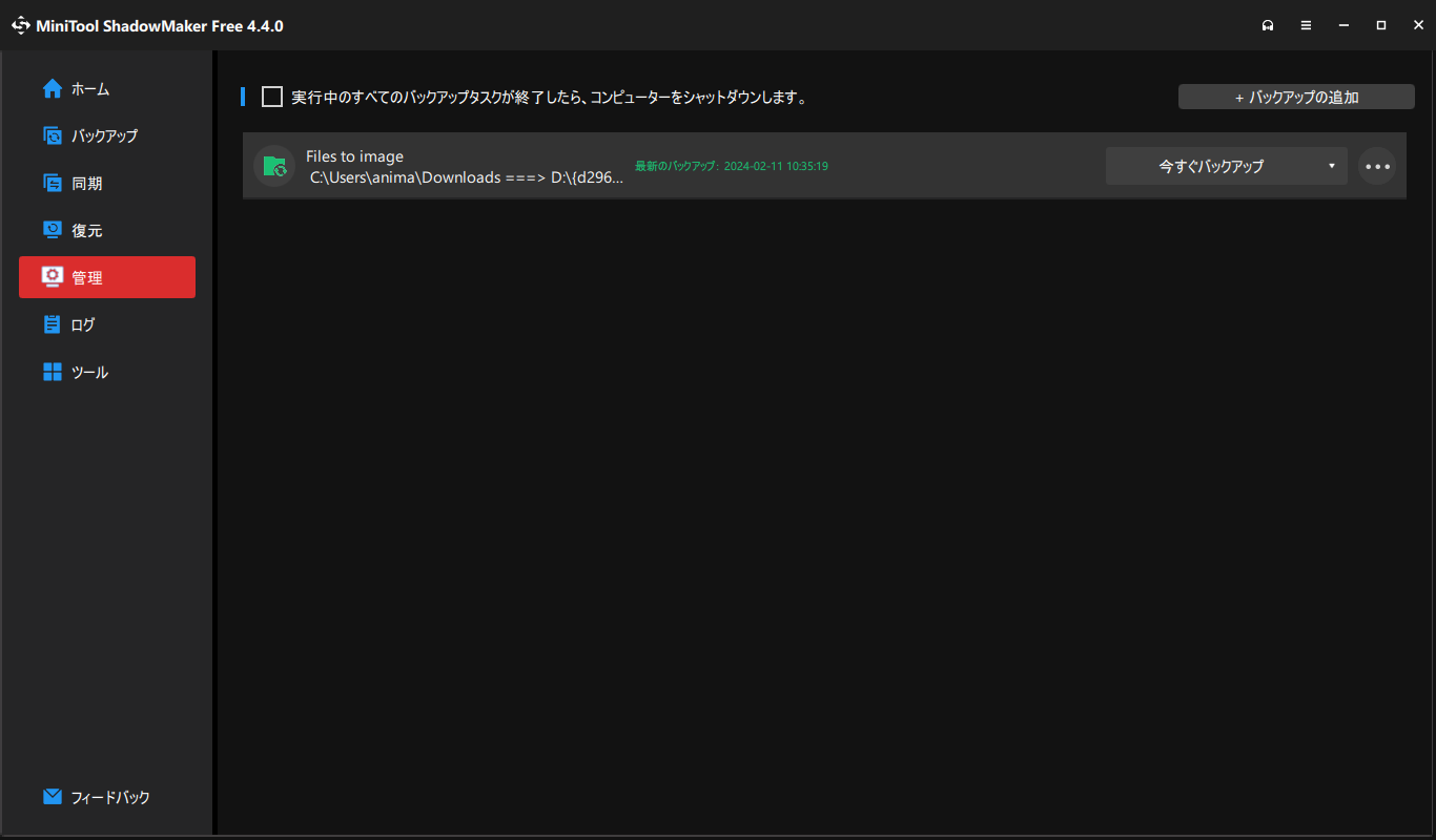 ここでは、MiniTool® ShadowMaker を使用したバックアップ方法を紹介します。例として C ドライブのダウンロードフォルダを、 D ドライブにバックアップしてみます。