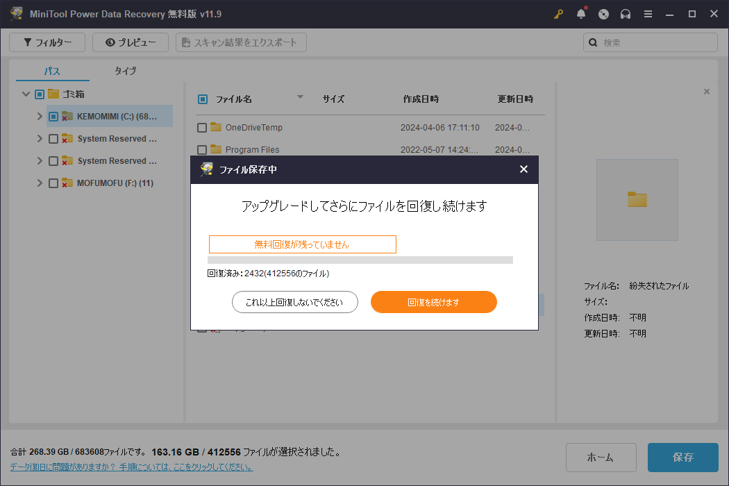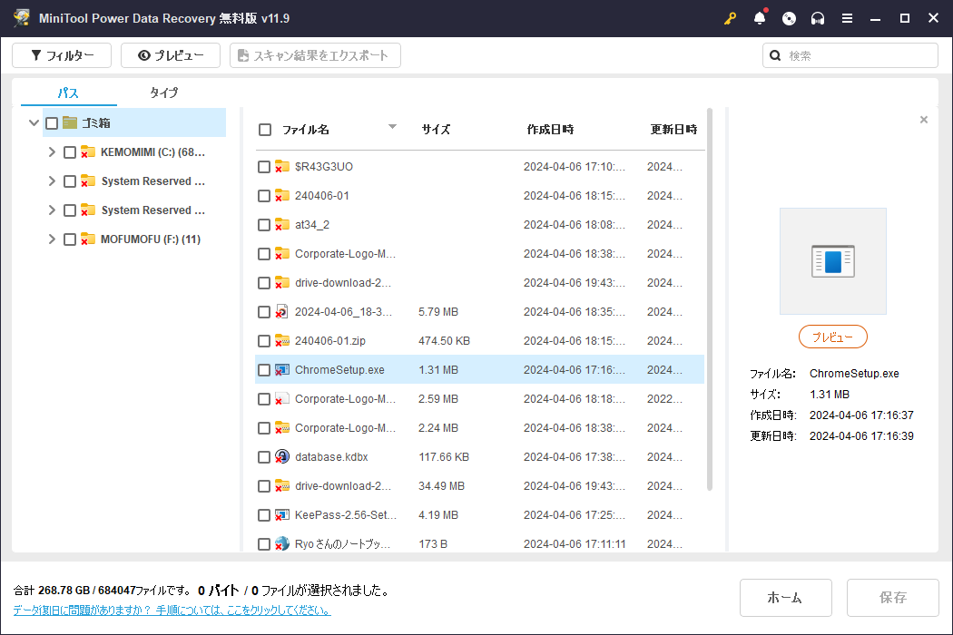 復元をしてみると不明なファイルが多くありましたが、中には exe ファイルがあったので、スキャン結果からあらかじめ復元するファイルを選択しておくと良いかもしれません。