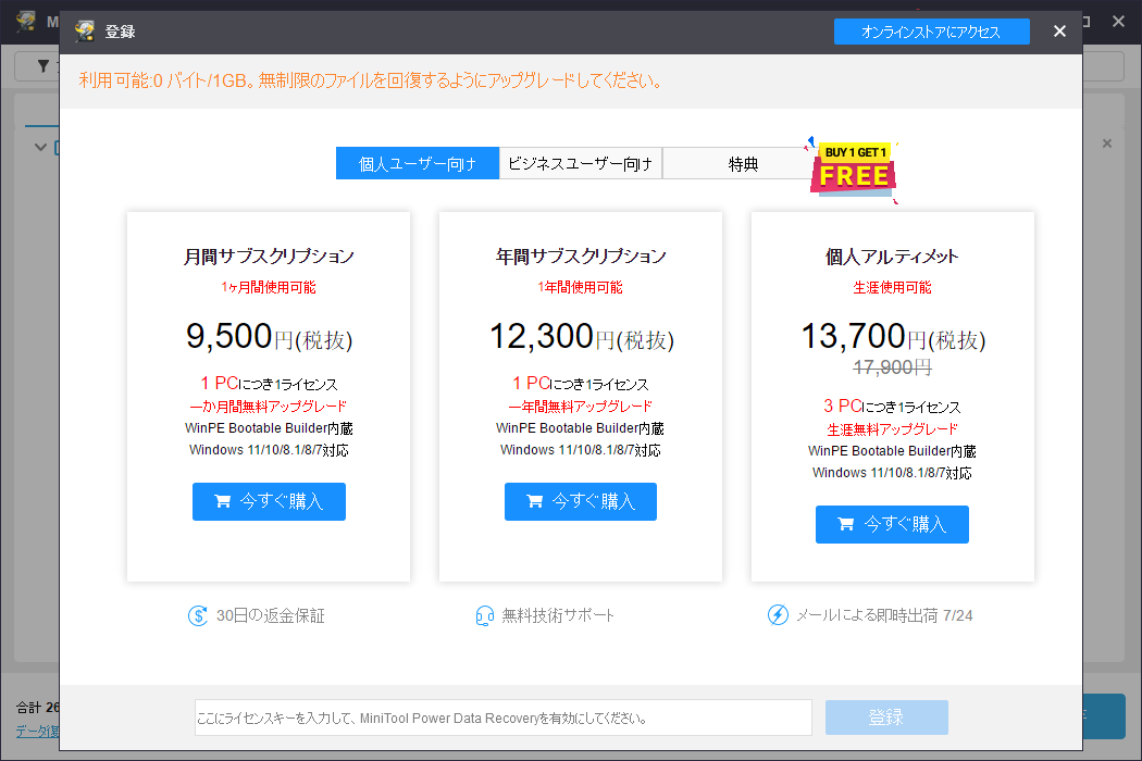 | 復元可能データ量の制限 | 1GB | 無制限 | 無制限 | 無制限 |