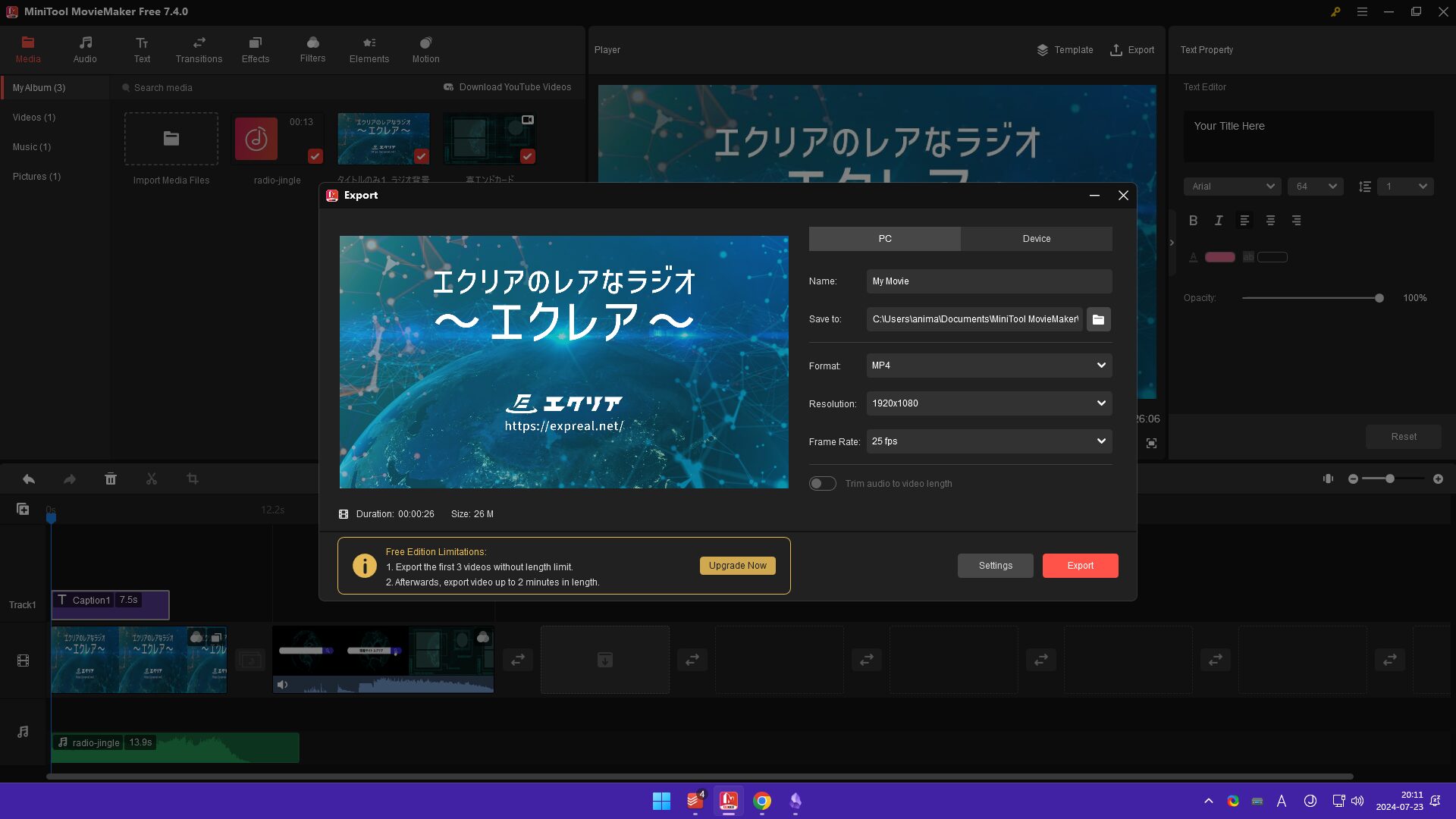 - 無料版は最初の 3 回のみ動画の長さが無制限で書き出しができます。それ以降は 2 分間に制限されます。