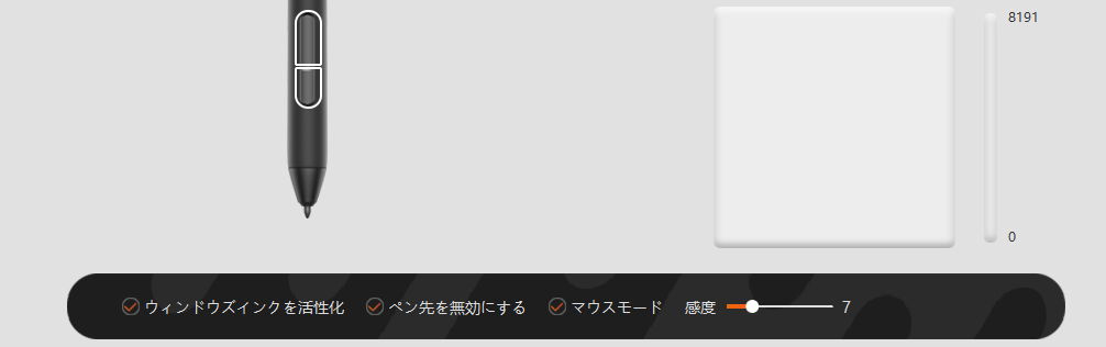 圧力感度、ペン本体の物理ボタン設定、ペン先の動作設定が可能。