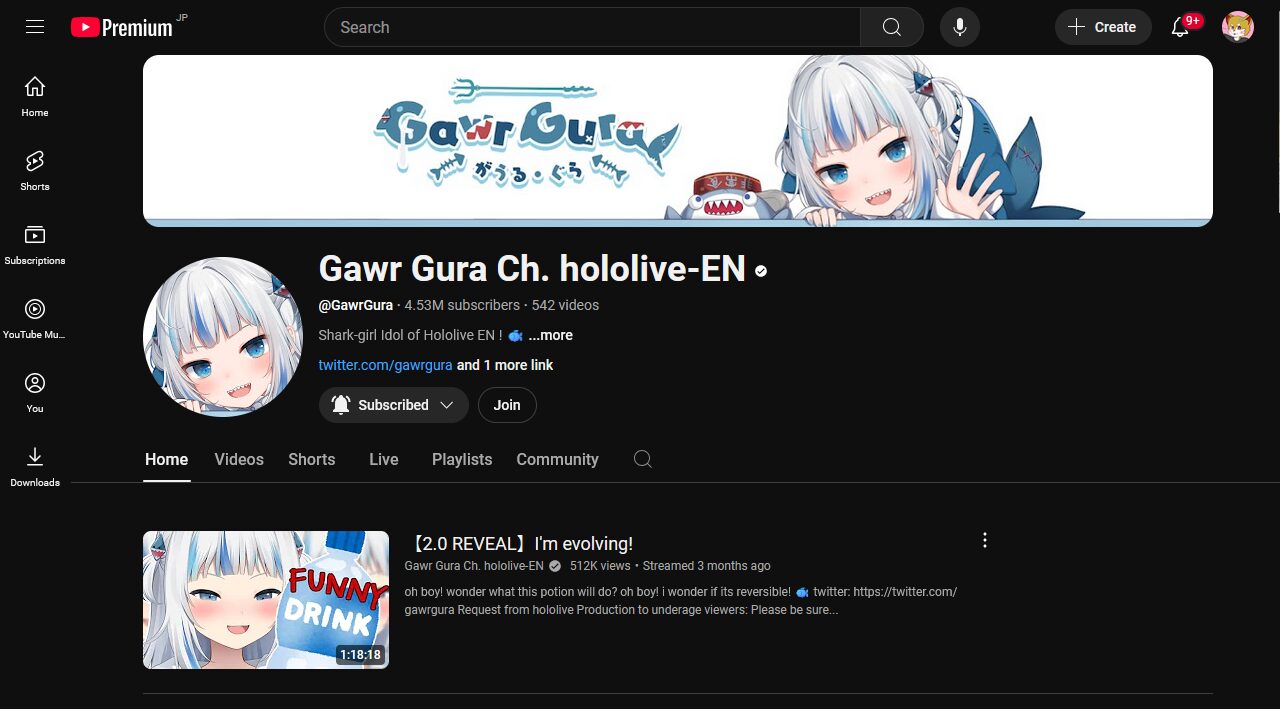 2025 年 1 月 4 日時点で「がうる・ぐら」のチャンネル登録者数は 453 万となっており、日本国内国外問わず絶大な人気を誇っている VTuber のひとりと言えます。